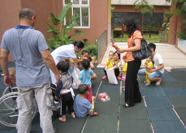 隨后,黃老師帶我們參觀了陽光幼兒園。小朋友正好在上戶外活動課,運(yùn)動場上大概有10多個(gè)孩子,他們有的在玩蕩秋千,有的玩滑梯,有的在玩游戲,顯得十分開心……旁邊有一位男老師和女老師還有一位保育員在陪護(hù),還有一位大伯,是一名熱心的義工,在看護(hù)一位坐在輪椅上的腦癱兒童。孩子們看到我們來了,十分開心也很懂禮貌,紛紛叫道:“阿姨好!”我們也把手上帶來的糖果、餅干等分發(fā)給他們??吹竭@些孩子們,我們的問題一下多了起來,黃老師一一為我們做了解答,她介紹:“這些孩子有的是嚴(yán)重的地中海貧血癥、有的是先天性心臟病、有的是唐氏綜合癥,他們從小被父母遺棄,由福利院撫養(yǎng)長大。目前,幼兒園最小的孩子才10多天大,所以保育員們都需要24小時(shí)值班,晚上起來為孩子們沖奶粉、換尿布。醫(yī)院也配置了醫(yī)務(wù)室,為孩子們做康復(fù)治療。幼兒園也會定期帶孩子們到戶外活動,比如10月份將組織去海濱公園……”