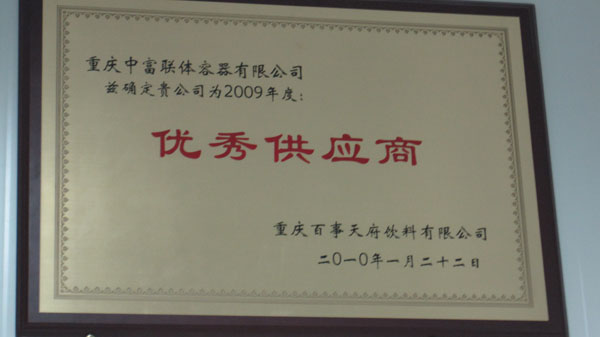 2010年1月22日在重慶百事年度總結(jié)大會上,重慶中富以其穩(wěn)定的產(chǎn)品質(zhì)量和完善的客戶服務(wù),在百事眾多的供應(yīng)商中脫穎而出,被重慶百事天府飲料有限公司授予“2009年度優(yōu)秀供應(yīng)商”稱號,連續(xù)三年獲此殊榮,充分反映了重慶百事可樂公司對重慶中富品質(zhì)與專業(yè)的肯定。